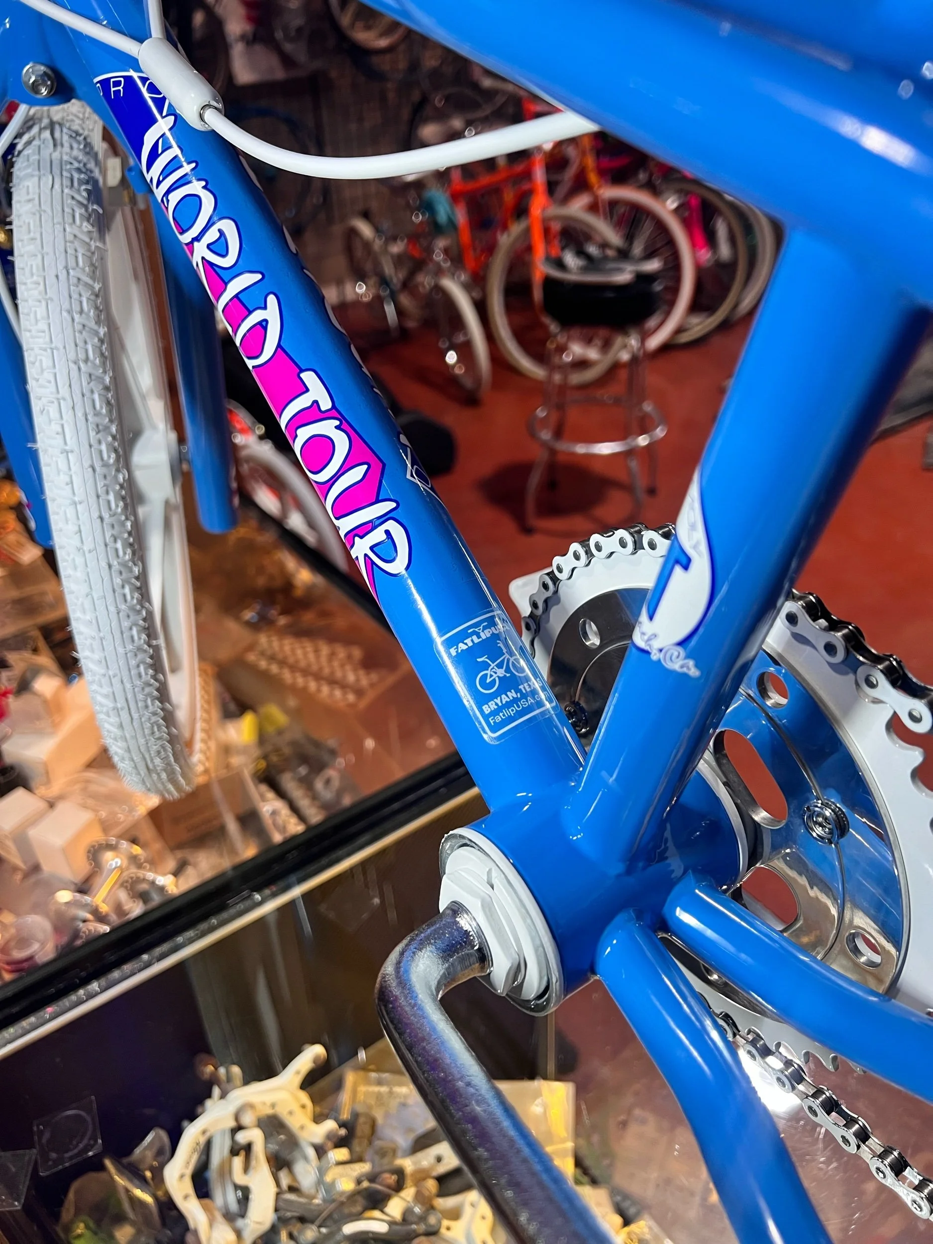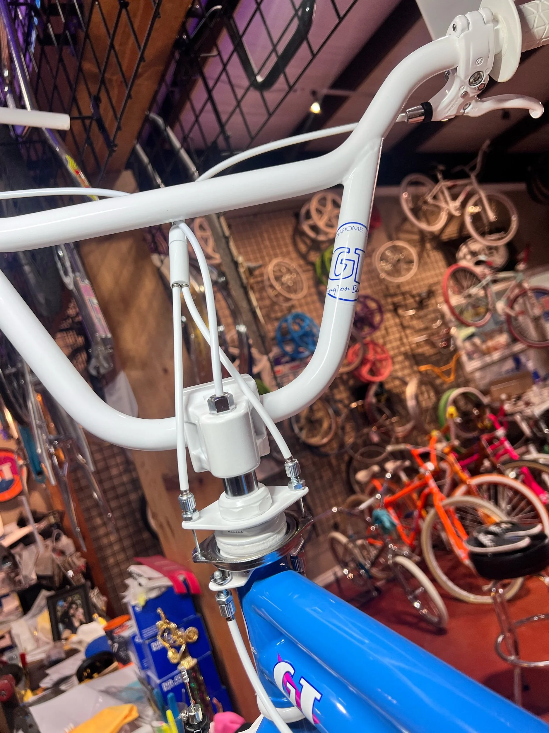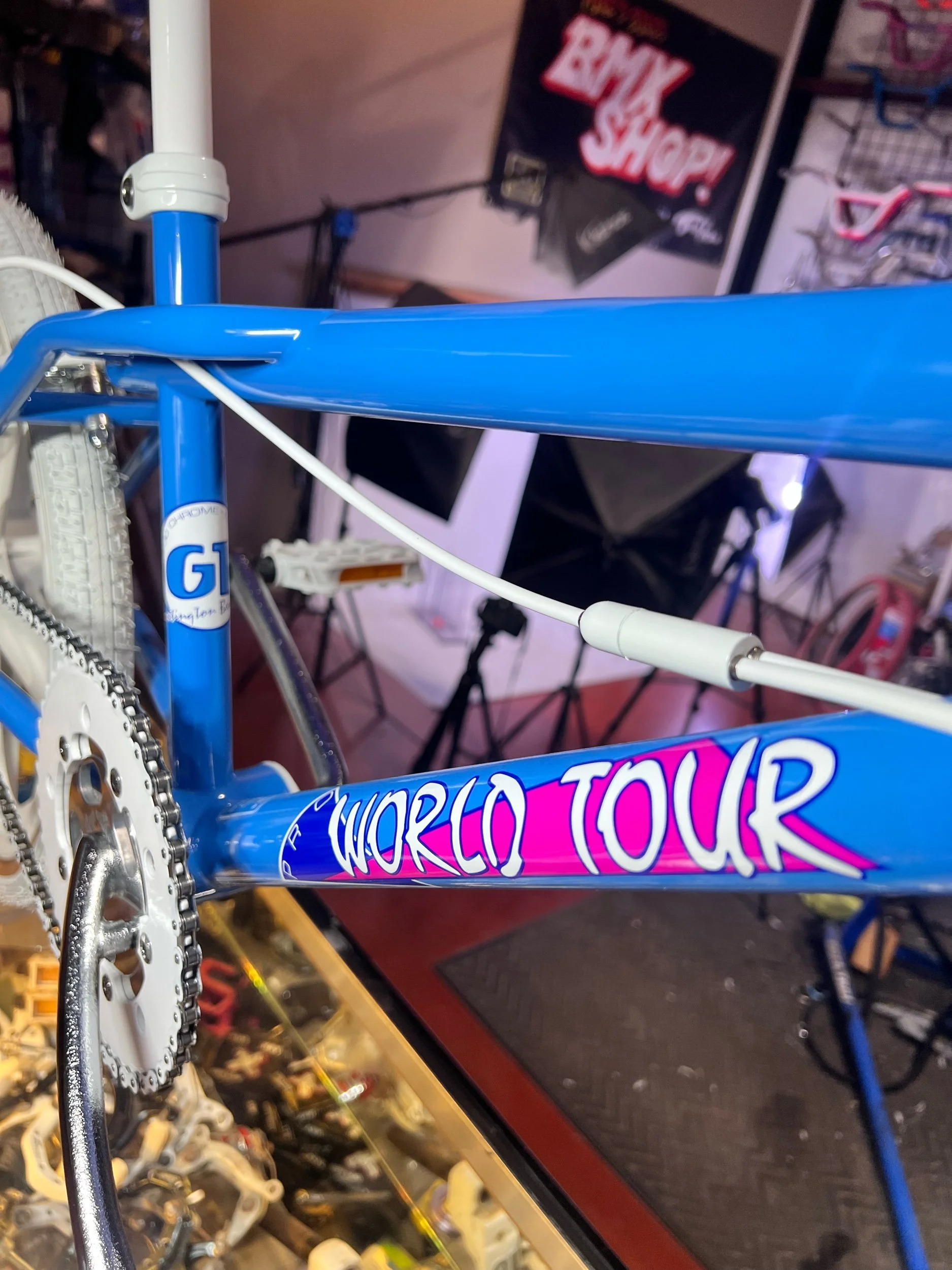 Available here is a Beautifully restored 1986 GT WORLD TOUR in blue powder coat,Rare dual cable guides . Handlebars & seat post have been powder coated white! This gives it the RAD vintage touch that graced the pages of BMX magazines of the 80’s! It’s the ultimate fountain of youth! This beautiful GT Pro World Tour has been restored with era correct high quality reproduction parts. This beautiful bike is ready to ride or hang in your man cave today! It features an original 1986 GT Pro World tour frame & fork in Maui Blue. Keep in mind these frames & forks are over 30 years old and are not always perfect. Stampings & serial numbers may be filled in due to powder coating. There may be small blemishes here & there. Bike stand does not come with the bike. Although this bike has been restored, we are still selling it as used with no returns, exchanges or warranty. Please view all the pictures we have provided here before purchasing. Please read our description on how we ship our 20” 80’s and 90’s bikes before you purchase. If you have any questions or concerns on this bike, please email us at mike@fatlipusa.com Before you purchase this bike. SHIPPING IN LOWER 48 STATES ONLY!! Parts list includes.
